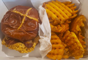 The fried chicken is breaded in cornmeal, making it different from fried chicken at other restaurants/ghost kitchens. It had a good crunch, but it needed more seasoning. At least the chicken inside was moist. In the pretzel sandwich ($12.25 base), the bacon and the mustard provided most of the flavor, as the pretzel bun tasted like a regular bun.