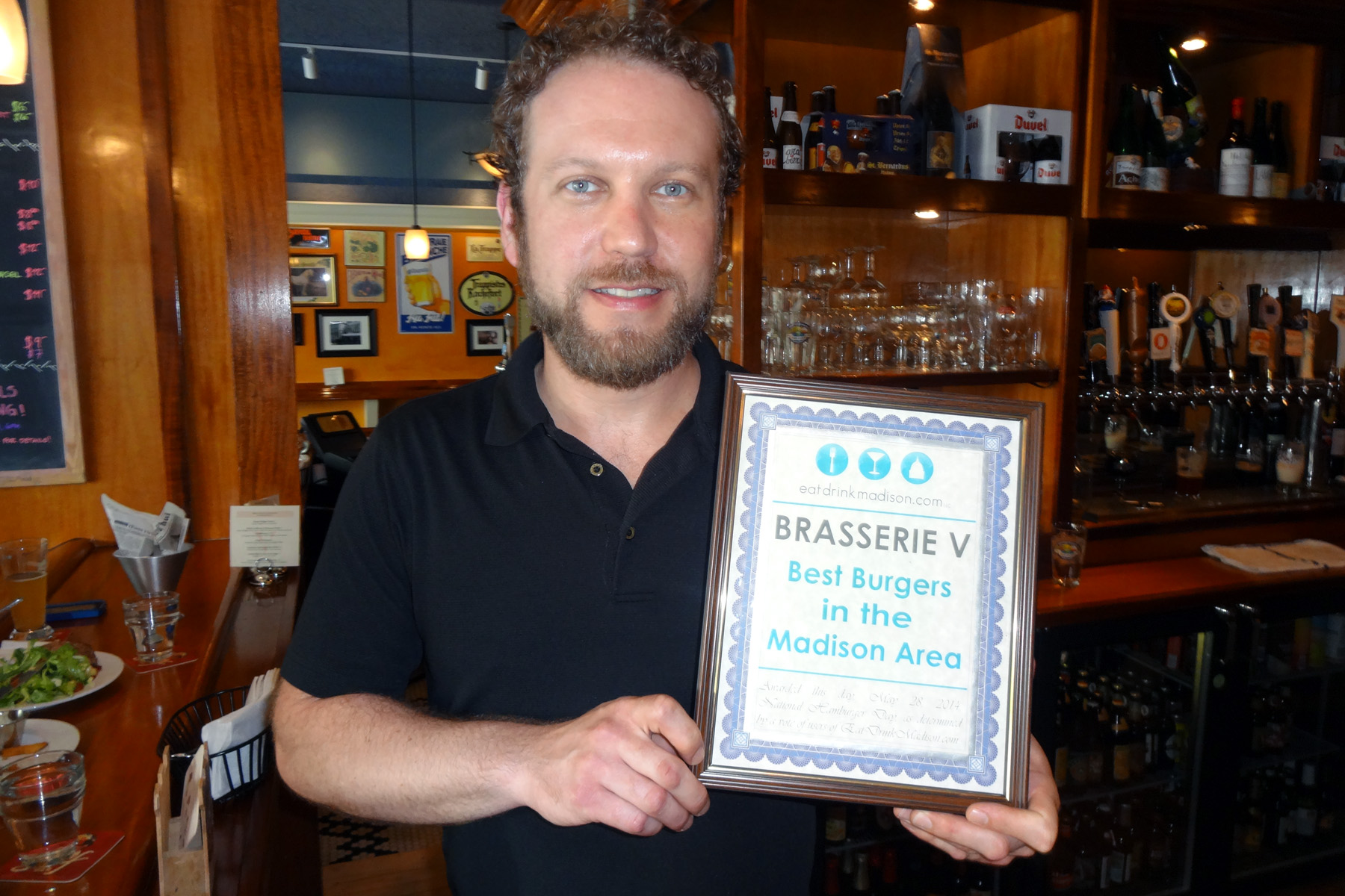 (MADISON, Wis.)--A bridesmaid no more. After narrowly taking second place last year, Brasserie V was the overwhelming choice for having the best burgers in the area in the annual EatDrinkMadison.com poll. Once neck-and-neck with second-place Tony Frank's, Brasserie V pulled ahead in the final week of voting to win with 80 percent of the vote. Meanwhile, Tony Frank's had 19 percent, and Dotty Dumpling's garnered one percent in the final round of voting, which took place May 16-29. EatDrinkMadison.com will present Brasserie V with a framed certificate and make the announcement through social media channels. The poll was conducted in May, during National Hamburger Month. Two-time defending champion Blue Moon did not advance past the first round (May 1-15), which featured 19 area restaurants and bars. In conjunction with the contest, one voter was selected to win a $50 gift certificate to the winning restaurant and a $15 iTunes gift card. This year's winner has the Twitter handle @karybeck. ### |