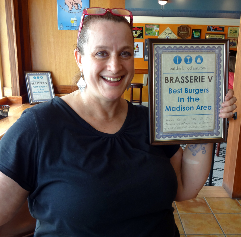 (MADISON, Wis.)--Back-to-back champion! For the second-consecutive year, fans selected Brasserie V as having the best burgers in the area in the annual EatDrinkMadison.com poll. In addition to also winning the first round of voting, Brasserie V (56 percent) took down the only other two-time winner, Blue Moon (40 percent). New finalist Oakcrest Tavern picked up four percent in the final round of voting, which took place May 16-28. EatDrinkMadison.com will present Brasserie V with a framed certificate and make the announcement through social media channels. The poll was conducted in May, during National Hamburger Month. The first round (May 1-15) featured 18 area restaurants and bars. In conjunction with the contest, one voter was selected to win a $50 gift certificate to the winning restaurant. This year's winner is Ellie G. ### |