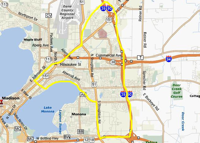 - East: E. Johnson Street to First Street to Lake Monona to Hwy 12/18 to I-39/90. MAP