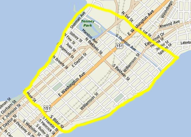 - Near East: Blair Street to First Street between Lake Mendota and Monona. MAP